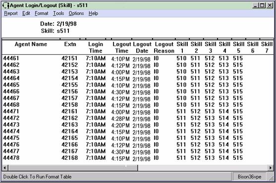 The Agent Login/Logout (Skill) report shows the times that agents in a given skill logged in and logged out, the reason codes associated with the logout (if there is one), and the skills with which the agents logged in and out. The Login/Logout (Skill) report is available in daily version only.