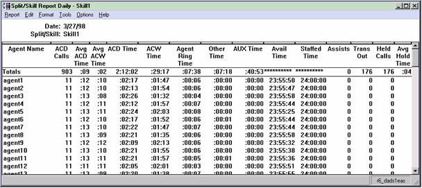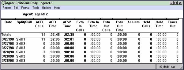 The Agent Split/Skill report shows an individual agent's performance by split or skill. The Agent Split/Skill report is available in interval, daily, weekly, and monthly versions. Each row in the report shows the total for the specified time for a particular split/skill the agent was logged into. However, the Totals: row shows the totals over the day for all splits or skills for this agent. Talk times are shown as totals, not as averages.