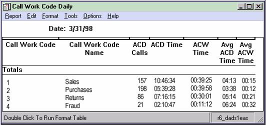 The Call Work Code report is available in daily, weekly, and monthly versions. The range of call work codes that may be reported on cannot exceed 1000. Call Work Codes can only be nine or fewer digits in each code if you want to assign names to the codes in the Dictionary.