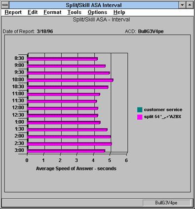 The Split/Skill Graphical ASA (Average Speed of Answer) report shows the average speed of answer for ACD calls answered in each selected split/skill for each selected interval.