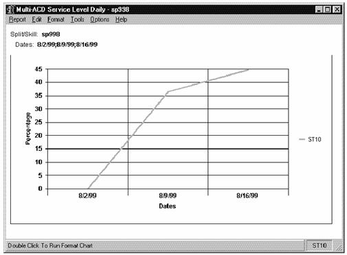 The Split/Skill Graphical Multi-ACD Service Level Report shows the Percent in Service Level achieved for a skill selected from one or more ACDs for each day. You can compare a split/skill in different ACDs and use the information to: