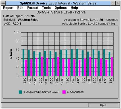 This report shows the percentage of ACD calls answered within the predefined acceptable service level and the percentage of ACD calls abandoned for the date and split or skill you specify. Each set of vertical bars is labeled with the start time for the service interval. The box below the chart is a legend.