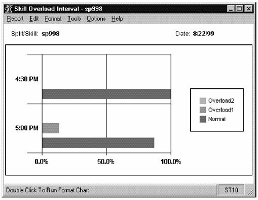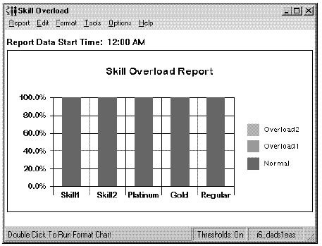 This report shows the amount of time each specified skill has spent in normal versus overload conditions from the report start time until the report generation time since a specified start time in the last 24 hours. This report is available only if you have purchased the Expert Agent Select (EAS) feature. The Graphical Skill Overload report is a vertical bar graph.