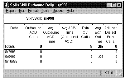 The Split/Skill Outbound report displays the numbers and average talk times for each type of outbound call for a given split/skill. It is useful primarily for splits/skills that use an adjunct to deliver outbound ACD calls or to dial outbound extension calls. This report requires the Outgoing Call Management application of ASAI. The Split/Skill Outbound report is available in interval, daily, weekly, and monthly versions.