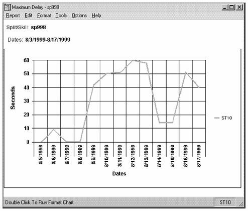 The System Graphical Maximum Delay report shows the maximum delay for one split/skill in one or more ACDs for each day selected. You can compare the split/skill across ACDs and use the information to determine which ACD has the longest delay in answering calls. You can specify one split/skill available across ACDs. The System Graphical Maximum Delay report is available in a daily version. Standard multi-ACD reports can include information on up to eight ACDs. This report is only available for DEFINITY R8 ACDs.
