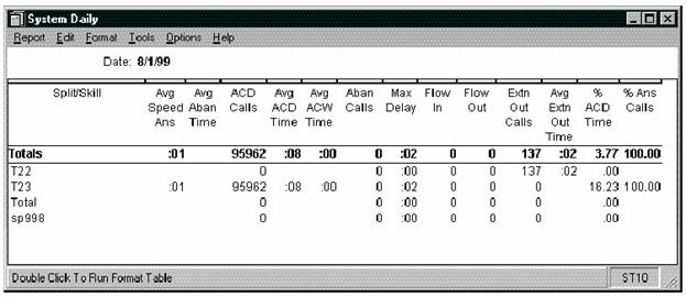 The System report summarizes the activity for a set of splits/skills for the same ACD. You can use this report to compare split/skill performance for splits/skills performing similar functions for the same ACD. The System report is available in daily, weekly, and monthly versions.