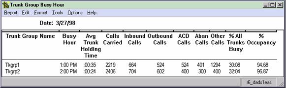 The Trunk/Trunk Group Busy Hour report displays the busiest hour of the day for each trunk group you select. The busiest hour is calculated as a set of contiguous intervals that make up an hour (one 60-minute interval, two 30-minute intervals, or four 15-minute intervals) in which the total holding time for the trunks in the trunk group was the maximum for the day. The Trunk/Trunk Group Busy Hour is available in daily version only. The busiest hour is calculated as a set of contiguous intervals that make up an hour (one 60-minute interval, two 30-minute intervals, or four 15-minute intervals) in which the total holding time for the trunks in the trunk group was the maximum for the day. You cannot customize this report.