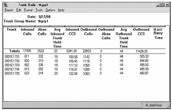 The Trunk report displays call traffic data for a single trunk. With this report, you can review trunks in any measured trunk group. You can use this report to verify that call traffic levels for a trunk are appropriate throughout the time period specified. You can also monitor outgoing calls made throughout the day. The Trunk report is available in interval, daily, weekly, and monthly versions. The report item Centum Call Seconds (CCS) is the number of 100-second increments in which the trunk was busy during the intrahour interval. A trunk is "seized'' while the call is both in queue and connected to an agent. Therefore, wait time for abandoned calls is figured into the CCS figures. For example, since a half-hour has 1800 seconds, the maximum CCS for each trunk in a trunk group is 18 CCS. Multiplying 18 CCS by the number of trunks in a trunk group gives you the maximum occupancy for the trunk group, which you can then compare with your actual CCS. If your intrahour interval is 15- or 60-minutes, your number will be different.