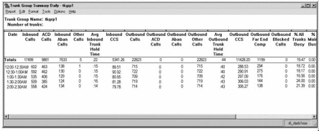 The Trunk Group report summarizes the incoming and outgoing traffic of every trunk in a trunk group for the specified time period. You could use this report to verify that the number of trunks available to your splits/skills is appropriate and to monitor the number of outgoing calls. Also, because it lists trunks by physical location on the switch and totals trunk failures, the Trunk Group report can be useful for troubleshooting problems with trunks.