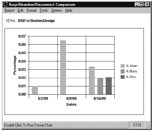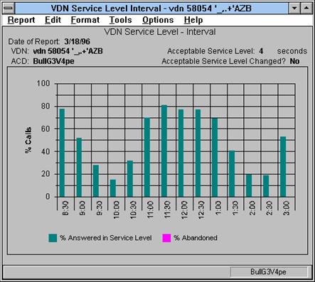 This report shows the percentage of ACD calls answered within the predefined Acceptable Service Level and the percentage of ACD calls abandoned for the date and VDN that you specify. Each set of vertical bars is labeled with the start time for the service interval.