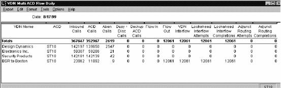 The VDN Multi-ACD Call Flow report shows call-handling data for the VDNs and the ACDs you select. This report can display information on up to eight ACDs. The VDN Flow Out report item includes only calls that route to another VDN and route to an external (off-switch) destination. The VDN Flow Interflow report item includes both Lookahead Interflow and non-Lookahead Interflow call completions. The VDN Multi-ACD Call Flow is available in daily, weekly, and monthly versions. You cannot customize this report.