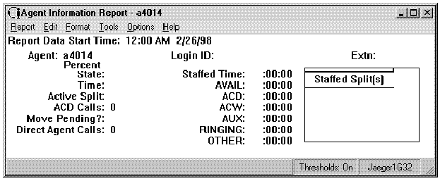 The Agent Information report shows information and statistics for an agent from a specified start time. This report is not available with the EAS feature.