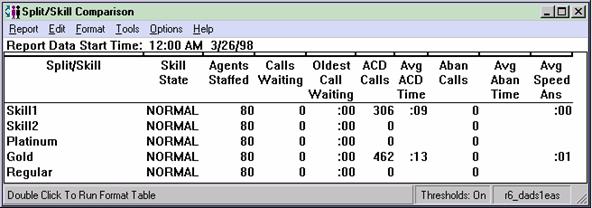 This report shows the current status and cumulative data for one or more splits or skills. Call center supervisors or administrators who are responsible for several splits/skill can use this report to see if splits/skills have comparable talk times, abandon rates, and average speed of answer figures that are comparable up until a certain point in the day.