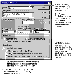 Changing attributes of a procedure may break applications that were compiled using previous versions of your control component. For example, it you use the Procedure Attributes dialog to change the default property or method of a control, code that relied on the default will no longer work.
