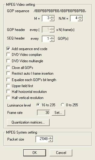 Make sure Add sequence end code is checked. DVD Video complian (there's a t missing there ;) does not have to be checked. Checking it would ensure that our video is flagged as having a maximum bitrate of 9800 kbit/s - compliant with the maximal bitrate of a DVD. However, this is only a flag and has no influence on the actual bitrate - but DVD authoring programs might read this value and decide that your combined audio and video bitrate is too high and refuse to author your content.