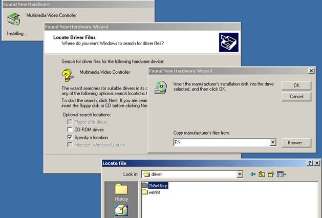 Shutdown the computer, plug out the power cord, Plug in the DSR2000 card to one PCI slot. Turn on the computer, the system will find new hardware, install driver from the path CD\DSR2000\driver\2k&nt&xp.