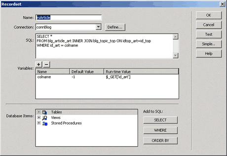 Figure 21. The rsArticle recordset in the advanced recordset dialog box
