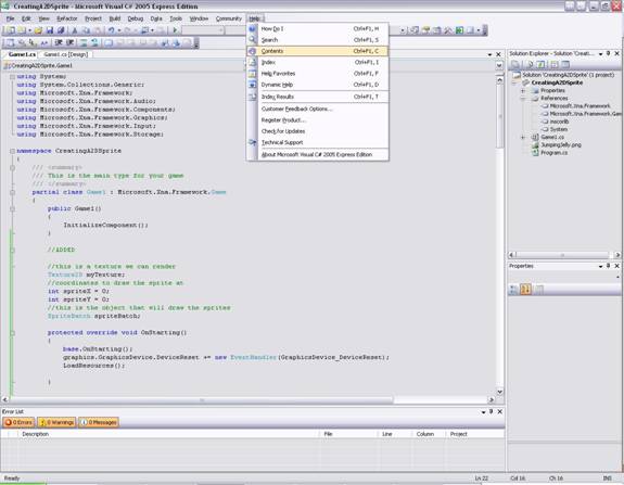 This will display a tutorial on the right side. This tutorial will walk you through creating you first game using XNA. By the end of the tutorial you will be able to draw a 2D sprite on the screen and move that sprite around on the screen.