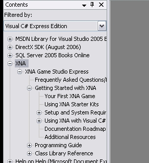 Now you will see quite a few categories. The one you'll be interested in to start with is the "Getting Started with XNA" category. Click on the "+" to expand the "Getting Started with XNA" category.