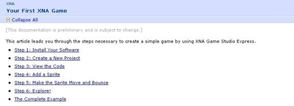 This will expose quite a few getting started categories. We'll start with the "Your First XNA Game" category. Click on the category to select the "Your First XNA Game" help topic.