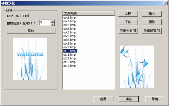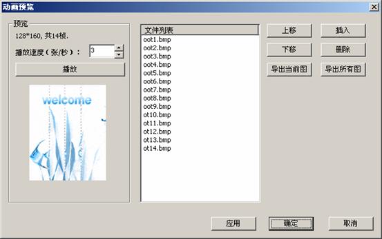 Boot Animation: File size max. 64kb, max. 30 pictures, 128 x 160 (i.e. 1.8 inch screen, total 14 pictures).