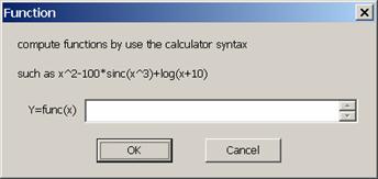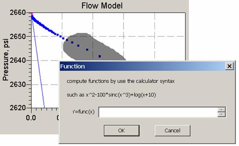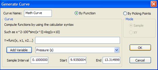 If the current display mode is function, clicking on this item brings up a Computation Formula dialog enable users create a curve using their own formula. Users may key in one of the four formulas and leave the rest blank. Y=func(x, y, s, t.) are for Cartesian coordinate, while X=func(t) and Y=func(t) are for polar coordinate. Any current curve are available as input, so user just need to add the input curve as variable, such as to input Pressure as variable s and now user can type in the formula to calculate a new curve based on x, s.