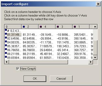 Import an ASCII (*.CSV) file into BYGraph. When users open a CSV type file, a pop-up import configuration dialog box is showed on the screen (see the below figure).