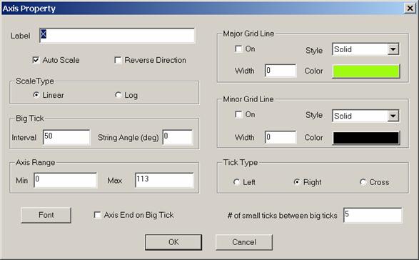 Users can decide whether the axis needs the major gird, minor grid or both by turning on or off the check boxes. If major/minor grid is on, it can be displayed on the graph plot area. Also, as curve, user can modify grid's line style, color and width.