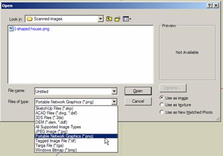 Find the folder "Scanned images" and find the file "l-shaped house".In case the file does not appear on the list, you may need to click on "Files of type" below and find "(*.png)".