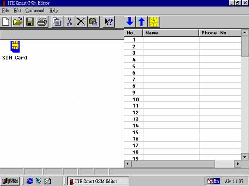 The right half of the screen displays the entries of the SIM card, and the left half of the start screen shows all the saved SIM files. Because there are no SIM files in this example, the right half of the screen shows no entries.