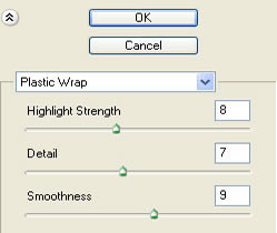 Next click on Filter>Artistic>Plastic Wrap. The Plastic Wrap window appears as in the image below right, experiment these settings and click OK.