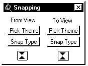 The Snap Type button allows you to specify how you want the snapping to take place. The choices are None, To Closest Vertex, To Closest Boundary, To Closest EndPoint, and To Nearest Intersection. The Tool at the bottom is the Snap Tolerence tool which allows you to set the Snap Tolerence. If you want to use snapping you must choose a theme, type and tolerence for both the FROM View, and TO View.