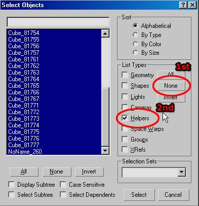At this point, all the helpers (and only the helpers) from the imported 3DS model are selected. You can now group them for hiding or simply hit the Delete key on the keyboard.