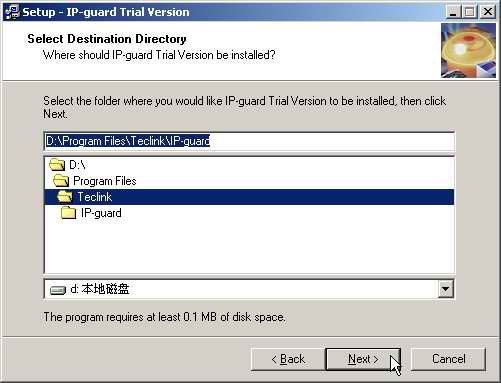 The system will remind user to choose the installation path. User can also change the installation path to choose a driver with high capacity to install IP-guard Server by clicking Browse. Click Next to continue after choosing the destination path.