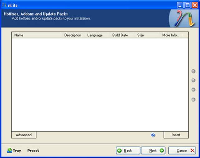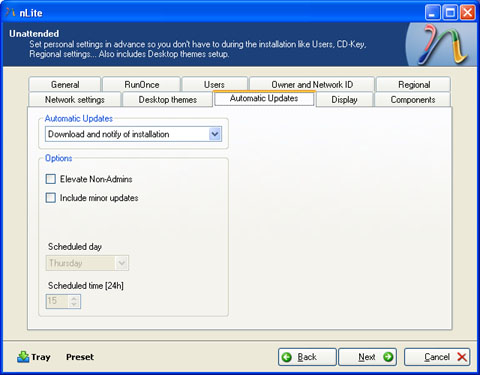 Select "Hotfixes, Addons...", "Components", "Unattended", "Options," "Tweaks", "Boot ISO" and click Next.