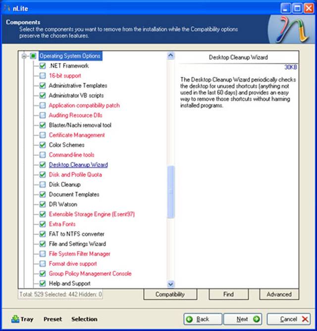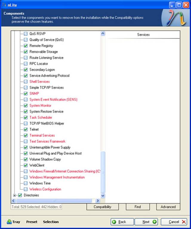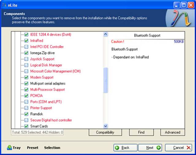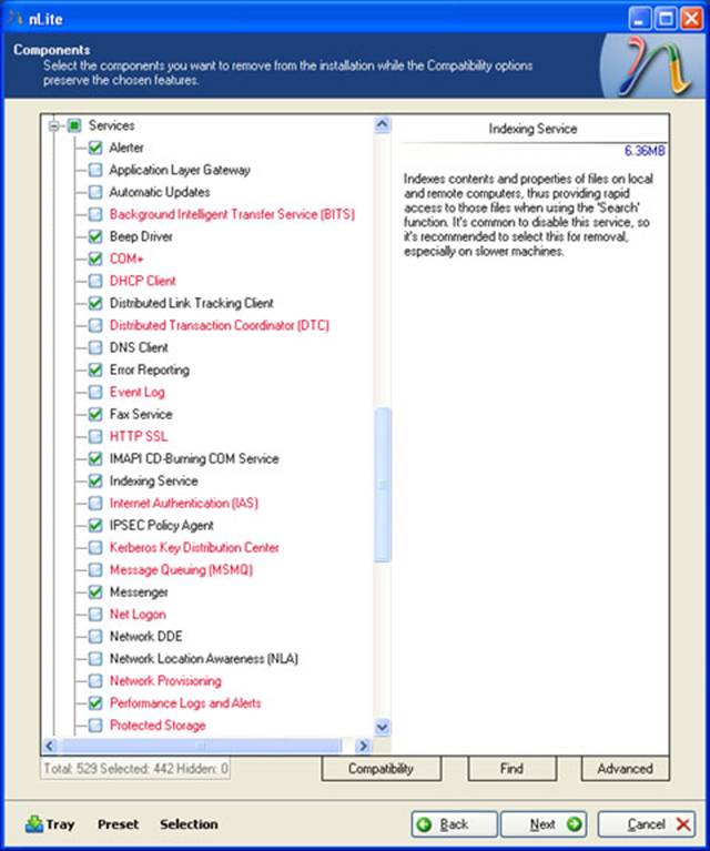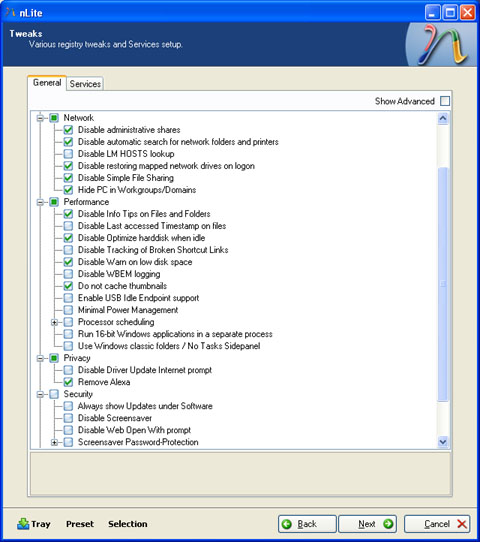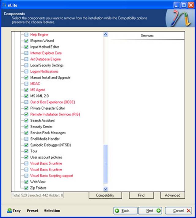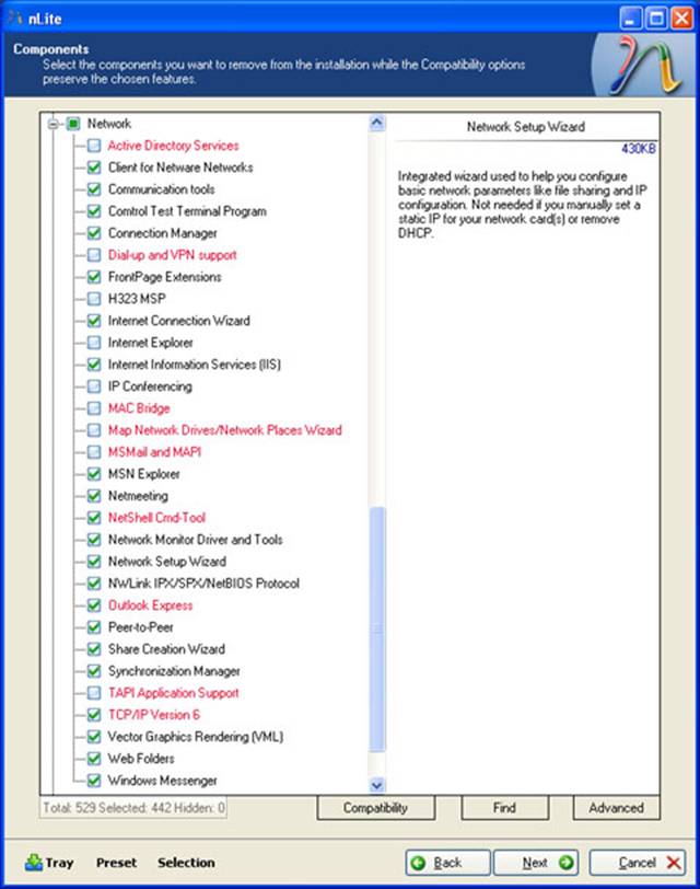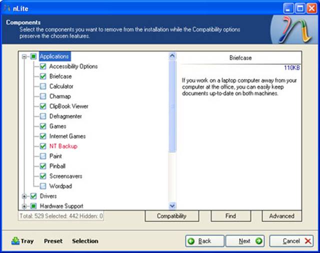Running through nLite is pretty simple, but takes quite a bit of time. As a result, the instructions in this section will be pretty minimal... just pay attention to what I've done in nLite and clone all of my settings. If you see some items that I've removed that you are sure you want, like Bluetooth Support, feel free to uncheck those items. Beyond what you are 100% certain of, don't change anything. nLite allows you to easily break major features of Windows XP (like networking), so it's important that you not edit what you're not 100% sure of.