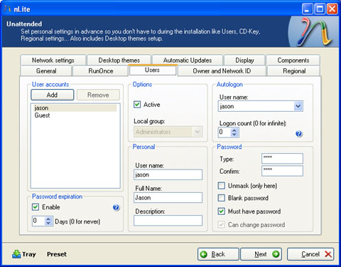 Click the Users tab and fill out the information like this. You can substitute a name for the name you want, and specify a password for that user account.