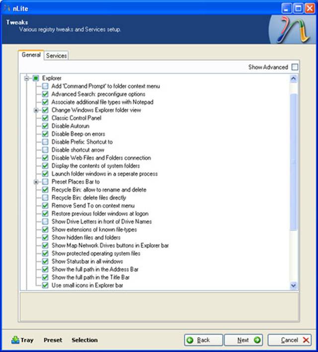 First, make sure you can view hidden files and folders. If you've followed my nLite install exactly you'll be able to. If you can't, open up an Explorer window and go to Tools and then Folder Options. On the View tab there's a radio button that says "Show Hidden Files and Folders." Click that radio button and then click "Ok."
