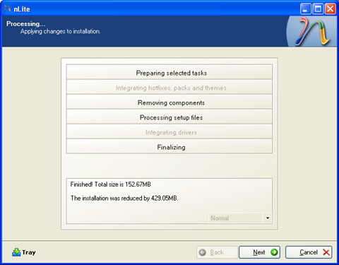 Once it's finished it'll tell you how big the new CD ISO is, and by how much it was reduced from the default install. In my instance, the new CD ISO is 152.67MB, and 429.05MB has been hacked from the full installation size. Good deal. Click next.