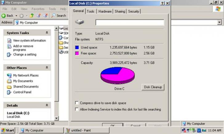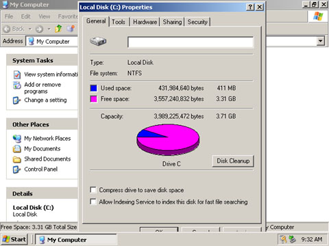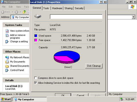 Go in to My Computer, right click the C drive, and select Properties. As you can see, we're using up about 1.3GB of sapce on Drive C. This is pretty good, but isn't really as good as it could be.