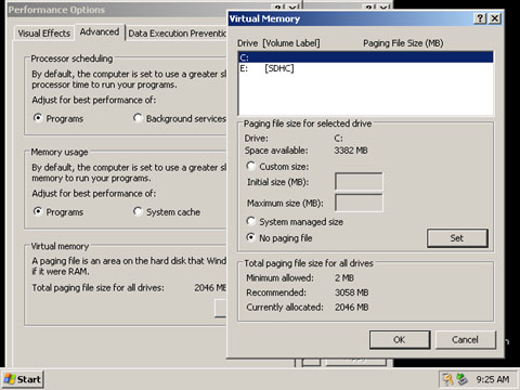 Click the radio button that says "No Paging File" and click the Set button. Click Ok to close that dialog. You'll get a notice that says that you have to restart for changes to take effect. Click Ok three times to get back to the desktop. You'll be asked to restart, click Yes.