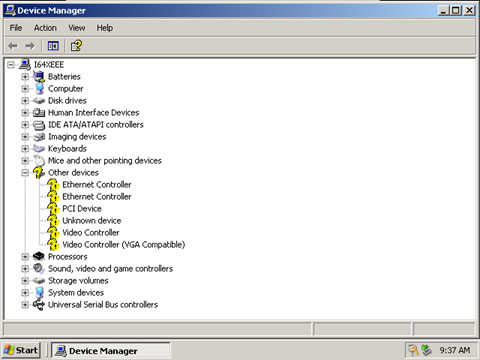 Right click on My Computer and select Properties. On the Hardware tab, click the Device Manager button. You'll see that we've got several pieces of hardware with yellow !'s next to them.