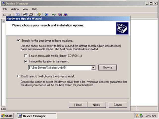 I'll explain how to install a driver for one device - it's the same for pretty much every device, so just repeat the steps for the remaining devices. The first Ethernet Controller that it doesn't reocgnize is the []. Right click on it and choose "Update Driver." When asked if you want to connect to Windows Update, choose No and click Next. On the next dialog, choose the button that says "Install from a list or specific location (advanced)" and click Next. Uncheck the box that says "Search removable media" and click the box that says "Include this location in the search." Use the Browse button to browse to the device where you unzipped the ASUS drivers and inside the folder where you extracted the wireless drivers, choose the ndis5x folder and click Ok.