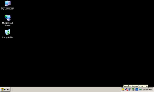 When Windows comes back up, Windows Update will begin downloading updates in the background. Let this process go until it's complete. Eventually you'll see a little yellow shield in the system tray that will let you know that udpates are being downloaded. This would be a good time to go and get a sandwich or something, as there are a lot of updates and downloading them all takes a while.