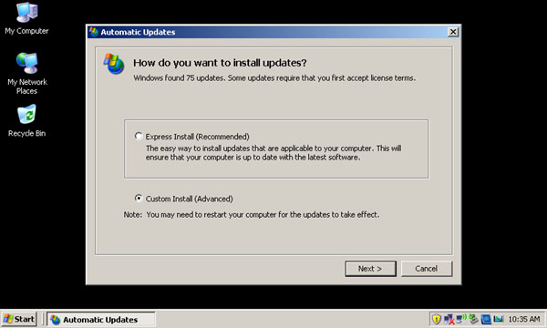 When all of the udpates have finished downloading, a yellow notification will appear above the shield icon in the system tray letting you know that updates are ready to be installed. Click this notification to bring up the Windows Updates dialog. Click the radio button next to "Custom Install (Advanced)" and click Next.