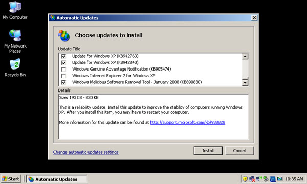 I'm going to be using Firefox on my Eee, but if you're using Internet Explorer you'll probably want to upgrade it to version 7. Scroll down to the bottom of the list of updates and uncheck "Windows Genuine Advantage Notification," and if you're not going to use IE7, uncheck "Windows Internet Explorer 7 for Windows XP" to save some space. Click Install.