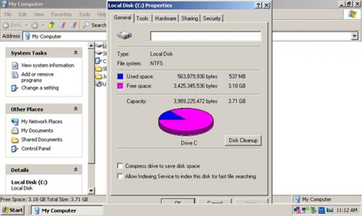 Right click on drive C in My Computer and choose Properties. Uncheck the box that says "Allow Indexing Service to index files..." and click Ok. This will save CPU useage and RAM by keeping Windows from indexing the entire file contents of the C drive for quick searches. Indexing might make sense for large, slow drives, but our tiny solid state drive will search fast enough without indexing enabled.