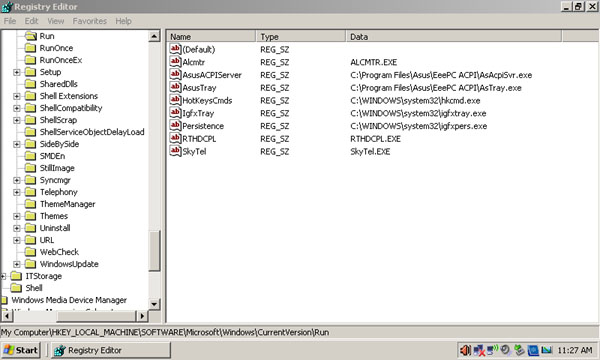 Click Start and then Run. Type regedit and press Enter. Navigate to HKEY_LOCAL_MACHINE\SOFTWARE\Microsoft\Windows\CurrentVersion\Run. Click on the Run folder and notice all of the programs that start up when your Eee starts up. Most of these were installed by installing the drivers from ASUS. You can delete as many of these as you want and your Eee will still start up just fine.