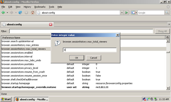 If you're going to install and use Firefox, it's best to disable precaching. To make itself "faster," Firefox's default behavior is to look at links on a page, go to each of them "behind the scenes" and start caching files. This way, if you click on one of those links, some of the items at that URL (like the page body itself) will already be downlaoded and cached and browsing will be sped up a bit. On a platform with limited drive space and memory like the Eee (especially if you disabled the page file) this can cause a problem, as Firefox will soon start eating up a lot of memory by precaching pages.To disable this, open up Firefox and in the address bar type about:config and press Enter. Scroll down until you find the line that says "browser.sessionhistory.max_total_viewers." Double click on that line and change the value from -1 to 0 and click Ok.