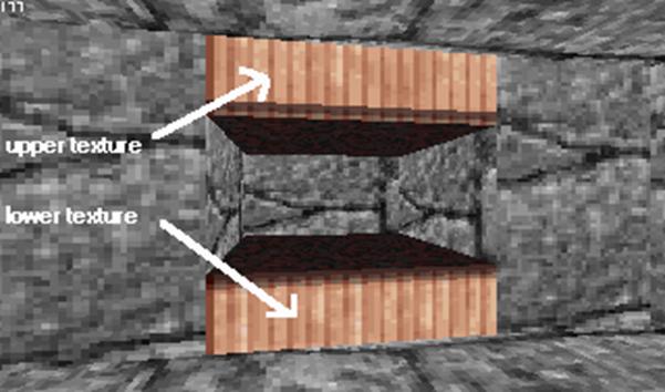 Example walls that have both an upper and a lower texture visible are walls that form a window. The texture above the window is the upper texture and the texture below the window is the lower texture. Because the Build engine draws textures from top to bottom by default the upper and lower window textures might not align properly with neigboring textures. To fix this press the O key on either the upper or lower texture to change the drawing orientation. Which surface's orientation should be changed depends on the sector heights in this area so the best way to get it looking good is to try it out.